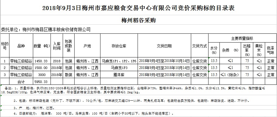 受客戶委托,梅州市嘉應(yīng)糧食交易中心有限公司定于2018年9月3日(星期一)舉辦糧食競價交易會,梅州市梅縣區(qū)穗豐糧食收儲有限公司擬采購2018年早秈稻5950.33噸。