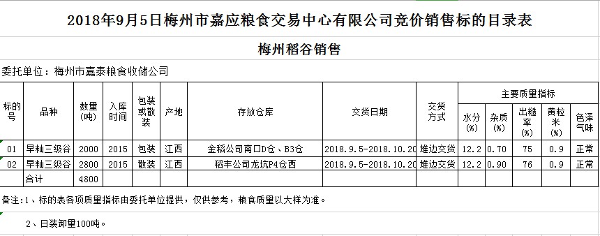 受客戶(hù)委托,梅州市嘉應(yīng)糧食交易中心有限公司定于2018年9月5日(星期三)舉辦糧食競(jìng)價(jià)交易會(huì),梅州市嘉泰糧食收儲(chǔ)公司擬銷(xiāo)售早秈稻4800噸。