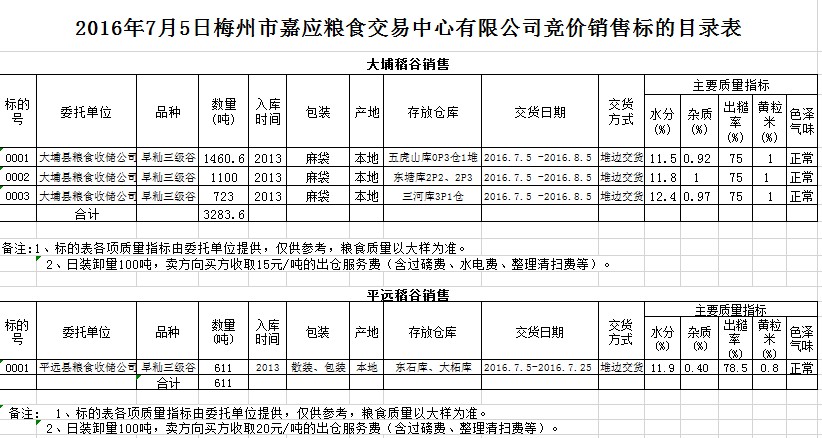 受客戶委托,梅州市嘉應(yīng)糧食交易中心有限公司定于2016年7月5日舉辦糧食競價交易會,大埔縣糧食收儲公司擬銷售2013年早秈稻谷3283.6噸,平遠(yuǎn)縣糧食收儲公司擬銷售2013年早秈稻谷611噸。