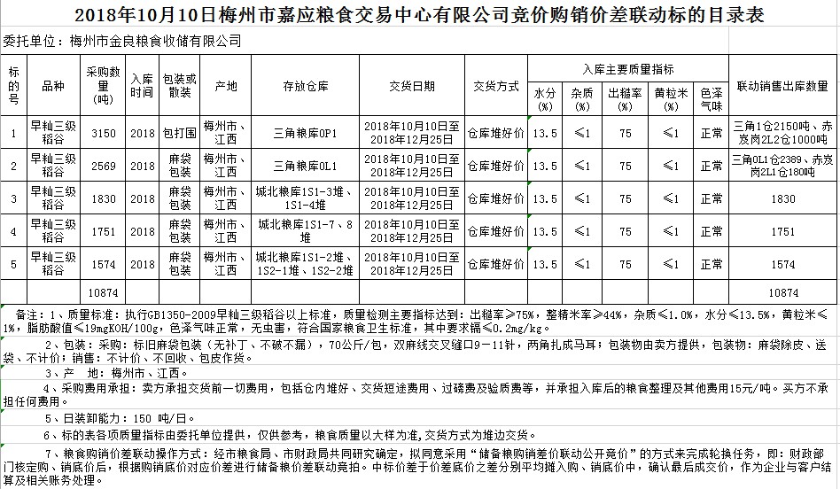 受客戶委托,梅州市嘉應糧食交易中心有限公司定于2018年10月10日(星期三)舉辦稻谷購銷價差聯(lián)動標的交易會,梅州市金良糧食收儲有限公司擬銷售和采購早秈稻10874噸。