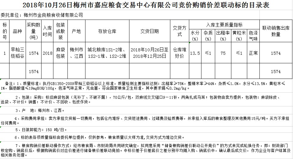 受客戶委托,梅州市嘉應(yīng)糧食交易中心有限公司定于2018年10月26日(星期五)舉辦稻谷購銷價(jià)差聯(lián)動標(biāo)的交易會,梅州市金良糧食收儲有限公司擬銷售和采購早秈稻1574噸。