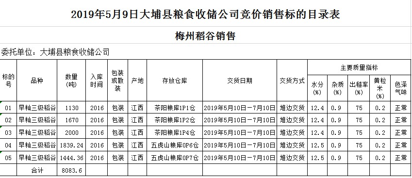 受客戶委托,梅州市嘉應(yīng)糧食交易中心有限公司定于2019年5月9日(星期四)舉辦糧食競價(jià)交易會(huì),大埔縣糧食收儲(chǔ)公司擬銷售2016年早秈稻8083.6噸。