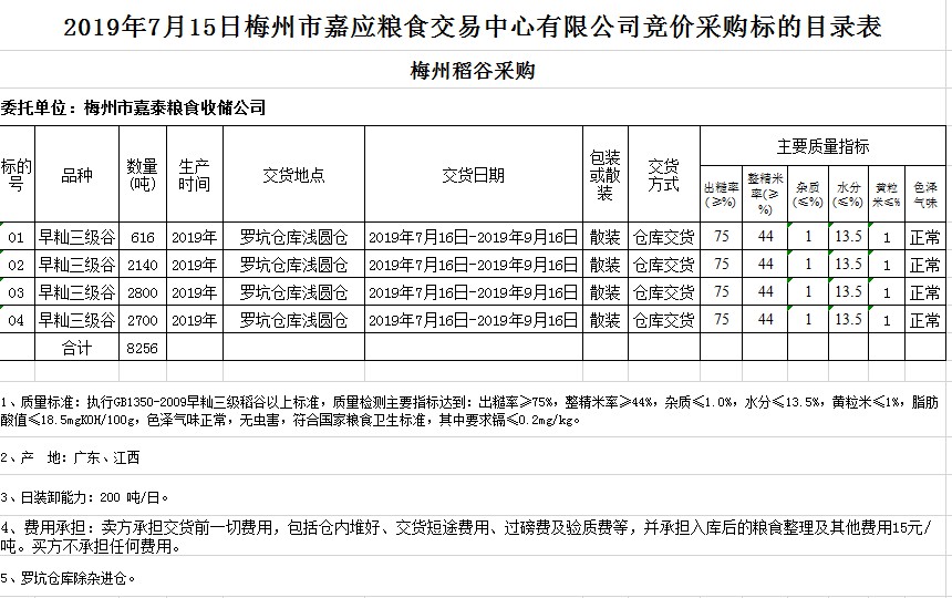 交易時間和地點:2019年7月15日(星期一)上午10時15分。廣東省梅州市彬芳大道南161號梅州市糧食交易中心3樓。