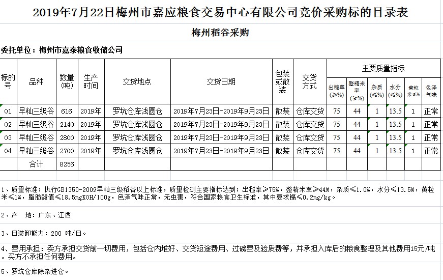 受客戶委托,梅州市嘉應(yīng)糧食交易中心有限公司定于2019年7月22日(星期一)舉辦糧食競價交易會,梅州市嘉泰糧食收儲公司擬采購2019年早秈稻8256噸。