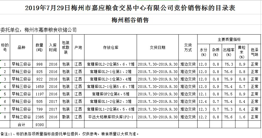受客戶委托,梅州市嘉應(yīng)糧食交易中心有限公司定于2019年7月29日(星期一)舉辦糧食競價(jià)交易會,梅州市嘉泰糧食收儲公司擬銷售2016年、2017年早秈稻9390噸。