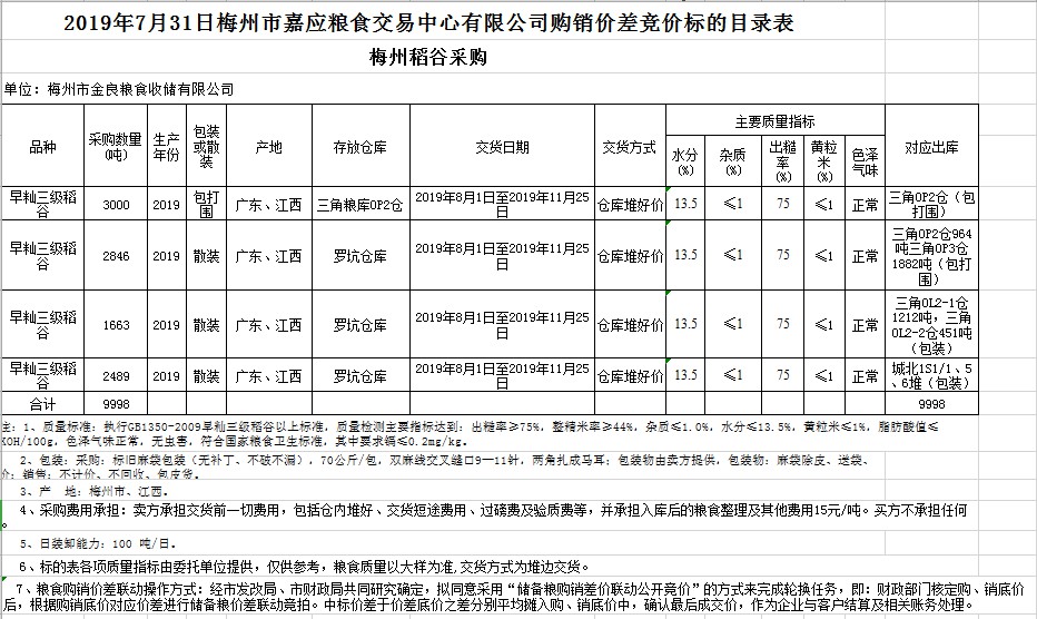 受客戶委托,梅州市嘉應(yīng)糧食交易中心有限公司定于2019年7月31日(星期三)舉辦稻谷購(gòu)銷價(jià)差聯(lián)動(dòng)標(biāo)的交易會(huì),梅州市金良糧食收儲(chǔ)有限公司擬銷售和采購(gòu)早秈稻9998噸。