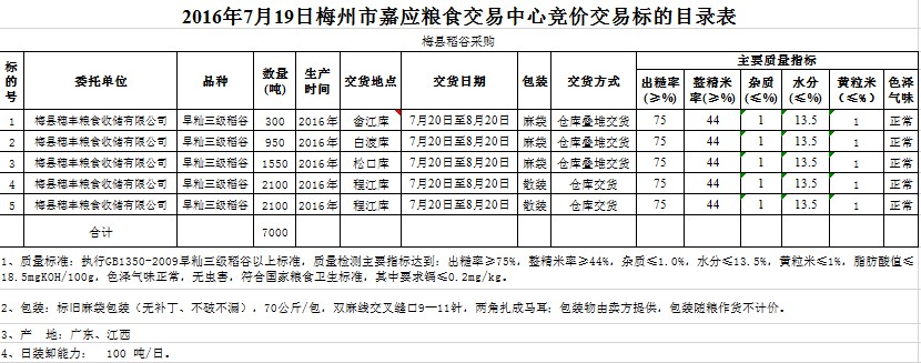 受客戶委托,梅州市嘉應糧食交易中心有限公司定于2016年7月19日舉辦糧食競價交易會,梅州市梅縣區(qū)穗豐糧食收儲有限公司擬采購2016年產早秈三級稻谷7000噸。