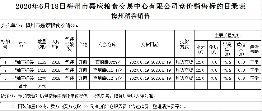 受客戶委托,梅州市嘉應糧食交易中心有限公司定于2020年6月18日(星期四)舉辦糧食競價交易會,梅州市嘉泰糧食收儲公司擬銷售2018年早秈稻3778噸。