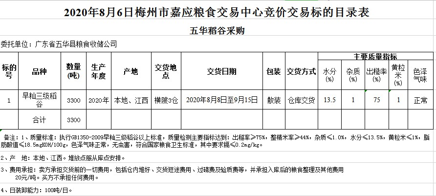 受客戶委托,梅州市嘉應(yīng)糧食交易中心有限公司定于2020年8月6日(星期四)舉辦糧食競價(jià)交易會(huì),廣東省五華縣糧食收儲(chǔ)公司擬采購2020年早秈稻3300噸。