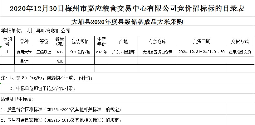 受客戶委托,梅州市嘉應(yīng)糧食交易中心有限公司定于2020年12月30日(星期三)上午10時在廣東省梅州市彬芳大道南161號梅州市糧食交易中心3樓,舉辦大埔縣縣級儲備成品糧采購公開招標(biāo)。