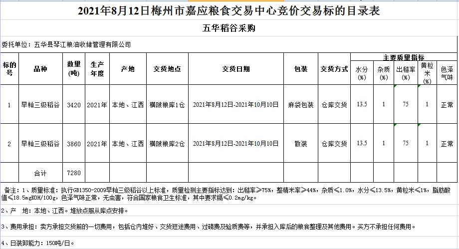 受客戶委托,梅州市嘉應(yīng)糧食交易中心有限公司定于2021年8月12日(星期四)舉辦糧食競價(jià)交易會(huì)。五華縣琴江糧油收儲(chǔ)管理有限公司擬采購2021年早秈稻7280噸。