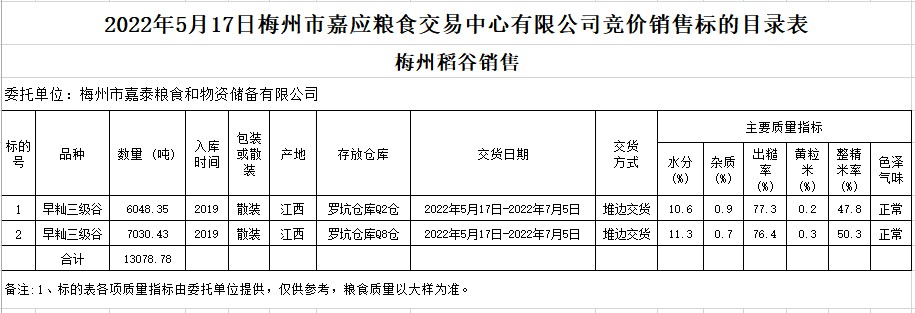 受客戶委托,梅州市嘉應(yīng)糧食交易中心有限公司定于2022年5月17日(星期二)舉辦糧食競價(jià)交易會(huì)。梅州市嘉泰糧食和物資儲(chǔ)備有限公司擬銷售2019年早秈稻13078.78噸。