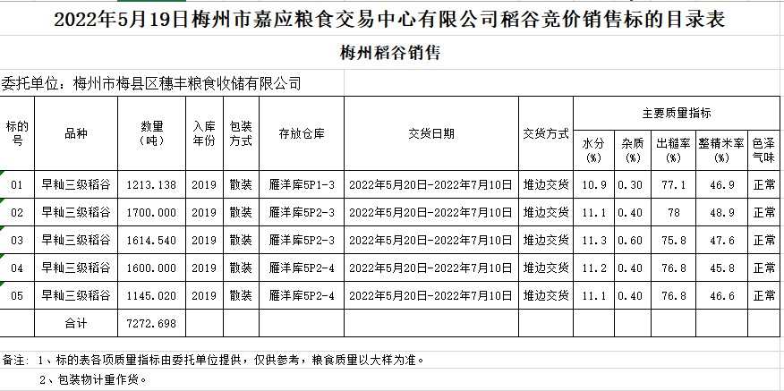 受客戶委托,梅州市嘉應(yīng)糧食交易中心有限公司定于2022年5月19日(星期四)舉辦糧食競價交易會。梅州市梅縣區(qū)穗豐糧食收儲有限公司擬銷售2019年早秈稻7272.698噸。