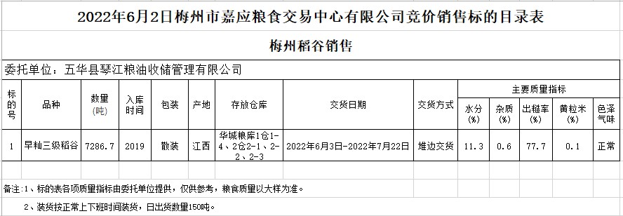 受客戶委托,梅州市嘉應(yīng)糧食交易中心有限公司定于2022年6月2日(星期四)舉辦糧食競(jìng)價(jià)交易會(huì)。五華縣琴江糧油收儲(chǔ)管理有限公司擬銷售2019年早秈稻7286.7噸。
