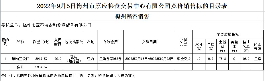 受客戶委托,梅州市嘉應(yīng)糧食交易中心有限公司定于2022年9月5日(星期一)舉辦糧食競價交易會。梅州市嘉泰糧食和物資儲備有限公司擬銷售2019年早秈稻2967.57噸。