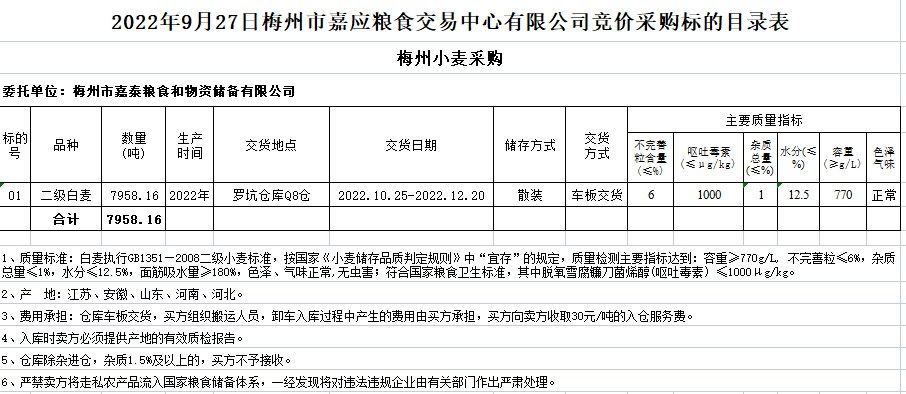 受客戶(hù)委托,梅州市嘉應(yīng)糧食交易中心有限公司定于2022年9月27日(星期二)舉辦糧食競(jìng)價(jià)交易會(huì)。梅州市嘉泰糧食和物資儲(chǔ)備有限公司擬采購(gòu)2022年二級(jí)白麥7958.16噸。