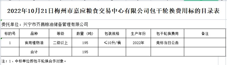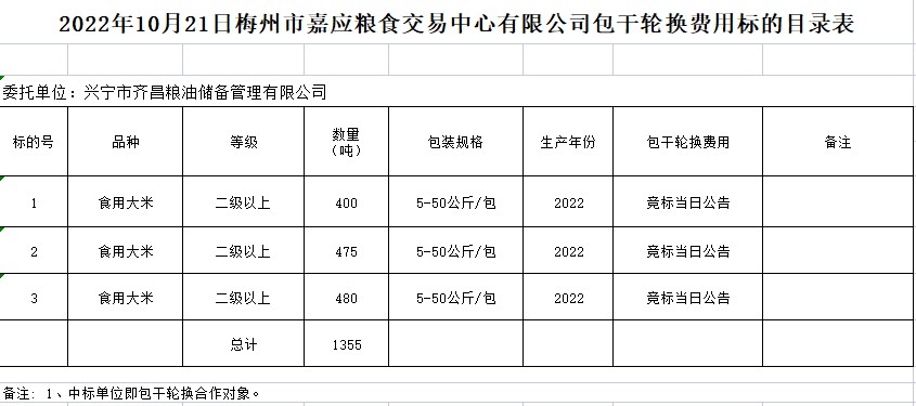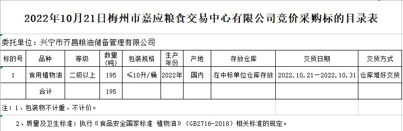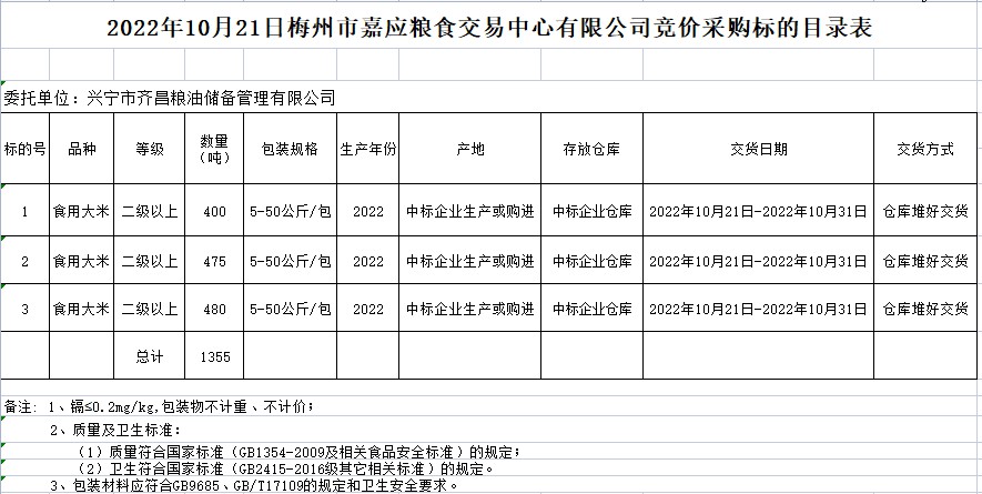 受客戶(hù)委托,梅州市嘉應(yīng)糧食交易中心有限公司定于2022年10月21日(星期五)上午10時(shí)在廣東省梅州市彬芳大道南161號(hào)梅州市糧食交易中心3樓,舉辦興寧市本級(jí)成品糧油動(dòng)態(tài)儲(chǔ)備競(jìng)價(jià)采購(gòu)及包干輪換費(fèi)用公開(kāi)招標(biāo)。