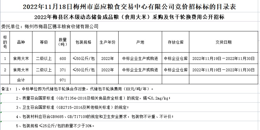 受客戶委托,梅州市嘉應糧食交易中心有限公司定于2022年11月18日(星期五)上午10時在廣東省梅州市彬芳大道南161號梅州市糧食交易中心3樓,舉辦梅縣區(qū)本級成品糧動態(tài)儲備代儲采購及包干輪換公開招標。