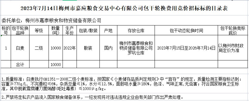 受客戶(hù)委托,梅州市嘉應(yīng)糧食交易中心有限公司定于2023年7月14日(星期五)上午10時(shí)15分在梅州市嘉應(yīng)糧食交易中心有限公司舉辦梅州市市級(jí)儲(chǔ)備糧小麥包干輪換(自主輪換)公開(kāi)招標(biāo)。