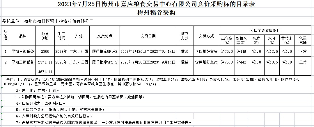 受客戶委托,梅州市嘉應糧食交易中心有限公司定于2023年7月25日(星期二)舉辦糧食競價交易會。梅州市梅縣區(qū)穗豐糧食收儲有限公司擬采購2023年早秈稻4671.11噸。