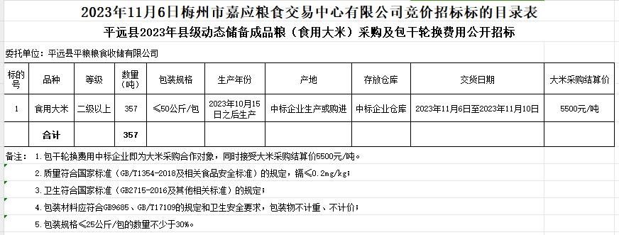 受客戶委托,梅州市嘉應(yīng)糧食交易中心有限公司定于2023年11月6日(星期一)上午10時在廣東省梅州市彬芳大道南161號梅州市糧食交易中心3樓,舉辦平遠(yuǎn)縣2023年縣級動態(tài)儲備成品糧(食用大米)采購及包干輪換費(fèi)用公開招標(biāo)。