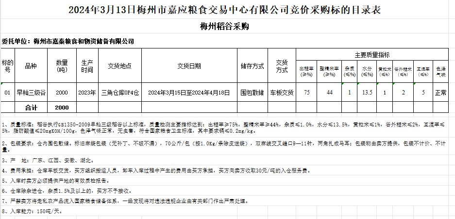 受客戶委托,梅州市嘉應(yīng)糧食交易中心有限公司定于2024年3月13日(星期三)舉辦糧食競價交易會。梅州市嘉泰糧食和物資儲備有限公司擬采購2023年早秈稻2000噸。