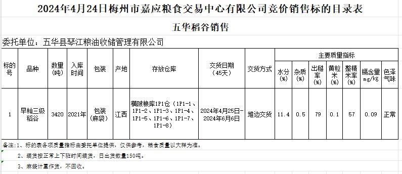 受客戶委托,梅州市嘉應糧食交易中心有限公司定于2024年4月24日(星期三)舉辦糧食競價交易會。五華縣琴江糧油收儲管理有限公司擬銷售2021年產(chǎn)早秈稻3420噸。