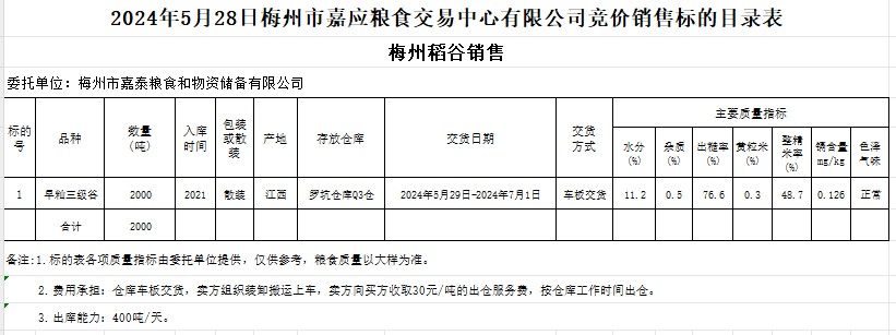 受客戶委托,梅州市嘉應(yīng)糧食交易中心有限公司定于2024年5月28日(星期二)舉辦糧食競價交易會。梅州市嘉泰糧食和物資儲備有限公司擬銷售2021年產(chǎn)早秈稻2000噸。