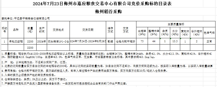 受客戶委托,梅州市嘉應(yīng)糧食交易中心有限公司定于2024年7月23日(星期二)舉辦糧食競(jìng)價(jià)交易會(huì)。平遠(yuǎn)縣平糧糧食收儲(chǔ)有限公司擬采購(gòu)2024年產(chǎn)早秈稻谷2200噸。