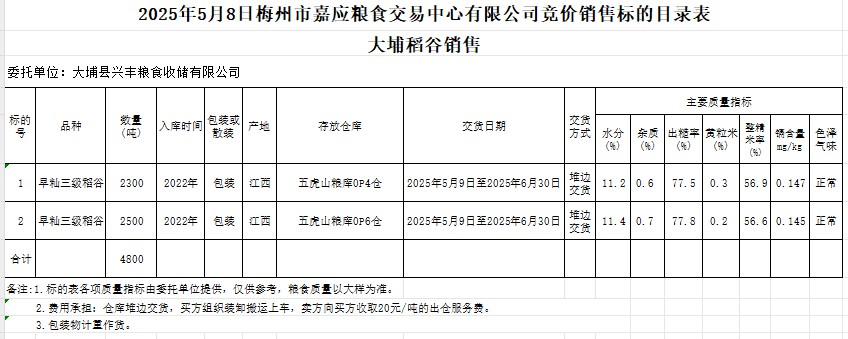 受客戶委托,梅州市嘉應糧食交易中心有限公司定于2025年5月8日(星期四)舉辦糧食競價交易會。大埔縣興豐糧食收儲有限公司擬銷售2022年產(chǎn)早秈稻谷4800噸。