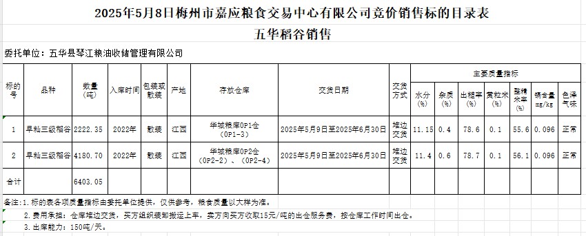 受客戶委托,梅州市嘉應糧食交易中心有限公司定于2025年5月8日(星期四)舉辦糧食競價交易會。五華縣琴江糧油收儲管理有限公司擬銷售2022年產(chǎn)早秈稻谷6403.05噸。