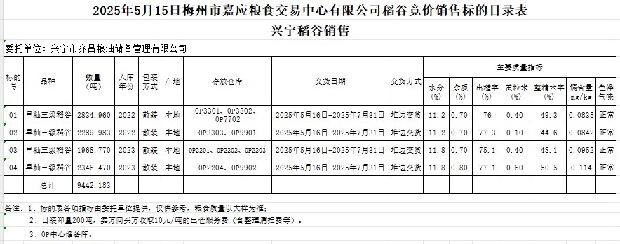 受客戶委托,梅州市嘉應(yīng)糧食交易中心有限公司定于2025年5月15日(星期四)舉辦糧食競(jìng)價(jià)交易會(huì)。興寧市齊昌糧油儲(chǔ)備管理有限公司擬銷售2022年、2023年產(chǎn)早秈稻谷9442.183噸。