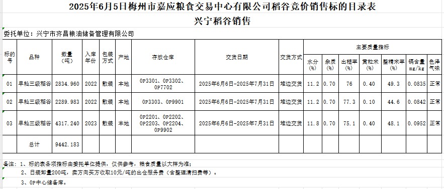 受客戶委托,梅州市嘉應(yīng)糧食交易中心有限公司定于2025年6月5日(星期四)舉辦糧食競價(jià)交易會。興寧市齊昌糧油儲備管理有限公司擬銷售2022年、2023年產(chǎn)早秈稻谷9442.183噸。