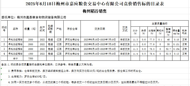 受客戶委托,梅州市嘉應(yīng)糧食交易中心有限公司定于2025年6月18日(星期三)舉辦糧食競價(jià)交易會(huì)。梅州市嘉泰糧食和物資儲(chǔ)備有限公司擬銷售2022年產(chǎn)早秈稻谷7500噸。