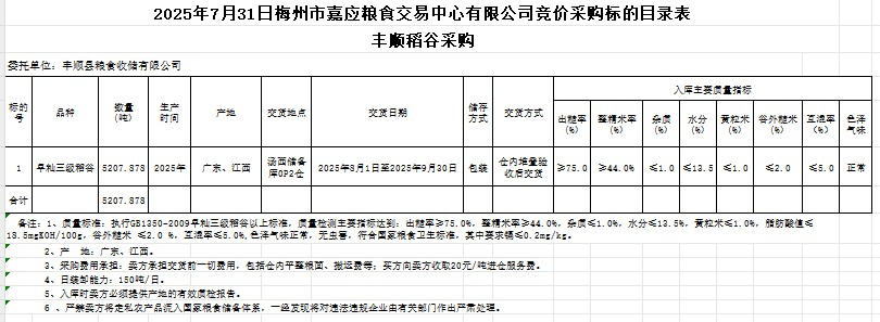 受客戶委托,梅州市嘉應(yīng)糧食交易中心有限公司定于2025年7月31日(星期四)舉辦糧食競價交易會。豐順縣糧食收儲有限公司擬采購2025年產(chǎn)早秈稻谷5207.878噸。