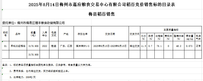 受客戶委托,梅州市嘉應(yīng)糧食交易中心有限公司定于2025年8月14日(星期四)舉辦糧食競價(jià)交易會。梅州市梅縣區(qū)穗豐糧食收儲有限公司擬銷售2022年產(chǎn)早秈稻谷3178.908噸。