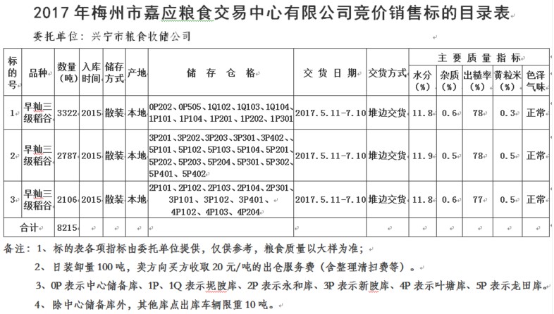 受客戶委托,梅州市嘉應(yīng)糧食交易中心有限公司定于2017年5月10日舉辦糧食競(jìng)價(jià)交易會(huì),興寧市糧食收儲(chǔ)公司擬銷售2015年早秈三級(jí)稻谷8215噸。(僅限現(xiàn)場(chǎng)交易)