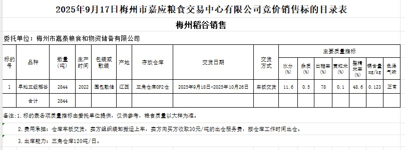 受客戶委托,梅州市嘉應(yīng)糧食交易中心有限公司定于2025年9月17日(星期三)舉辦糧食競價交易會。梅州市嘉泰糧食和物資儲備有限公司擬銷售2022年產(chǎn)早秈稻谷2844噸。