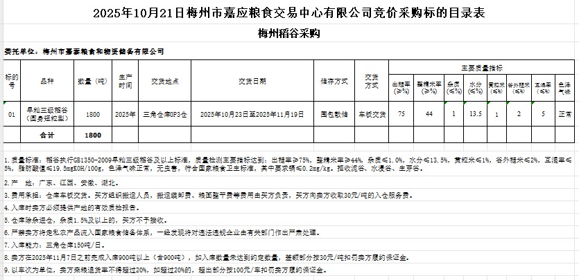 受客戶委托,梅州市嘉應糧食交易中心有限公司定于2025年10月21日(星期二)舉辦糧食競價交易會。梅州市嘉泰糧食和物資儲備有限公司擬采購2025年產(chǎn)早秈稻谷1800噸。