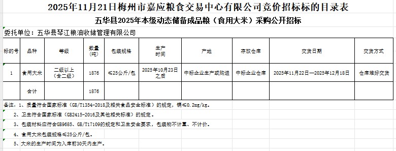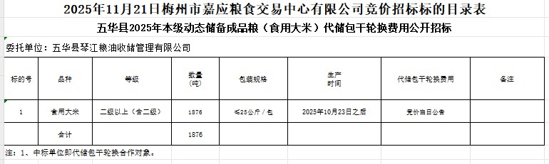 五華縣2025年本級(jí)動(dòng)態(tài)儲(chǔ)備成品糧(食用大米)采購(gòu)及代儲(chǔ)包干輪換費(fèi)用公開招標(biāo)公告
