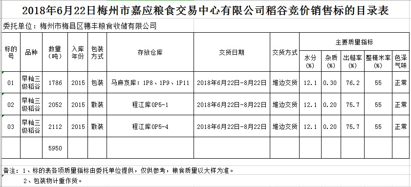 受客戶委托,梅州市嘉應(yīng)糧食交易中心有限公司定于2018年6月22日(星期五)舉辦糧食競(jìng)價(jià)交易會(huì),梅州市梅縣區(qū)穗豐糧食收儲(chǔ)有限公司5950噸。