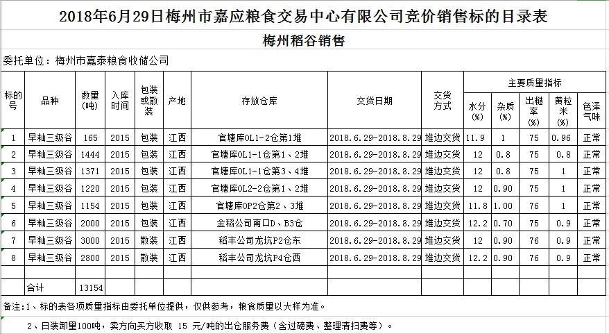 受客戶委托,梅州市嘉應(yīng)糧食交易中心有限公司定于2018年6月29日(星期五)舉辦糧食競(jìng)價(jià)交易會(huì),梅州市嘉泰糧食收儲(chǔ)公司擬銷售早秈稻13154噸。
