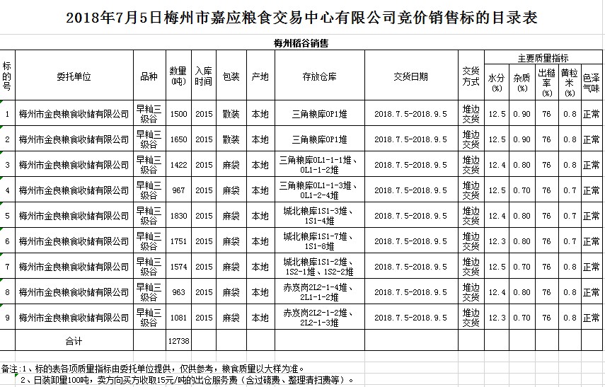 受客戶委托,梅州市嘉應(yīng)糧食交易中心有限公司定于2018年7月5日(星期四)舉辦糧食競(jìng)價(jià)交易會(huì),梅州市金良糧食收儲(chǔ)有限公司擬銷售早秈稻12738噸。