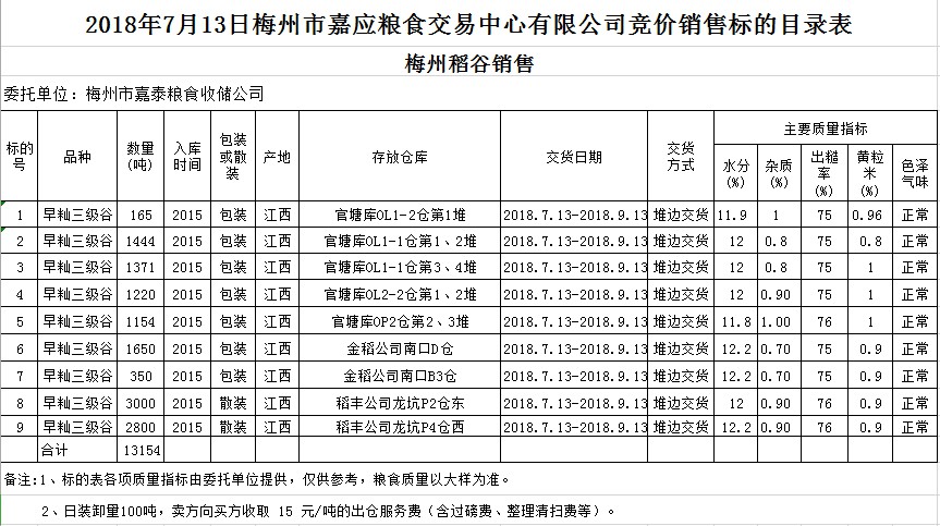 受客戶委托,梅州市嘉應(yīng)糧食交易中心有限公司定于2018年7月13日(星期五)舉辦糧食競價(jià)交易會(huì),梅州市嘉泰糧食收儲公司擬銷售早秈稻13154噸。