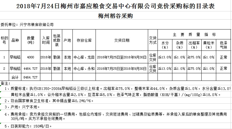 交易時間和地點:2018年7月24日(星期二)上午10時。廣東省梅州市彬芳大道南161號梅州市糧食交易中心3樓。
