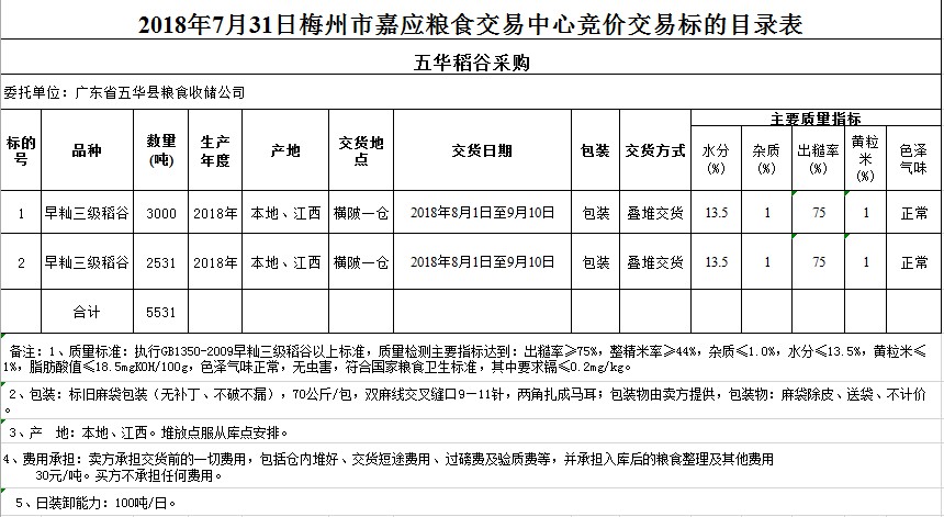交易時(shí)間和地點(diǎn):2018年7月31日(星期二)上午10時(shí)。廣東省梅州市彬芳大道南161號(hào)梅州市糧食交易中心3樓。