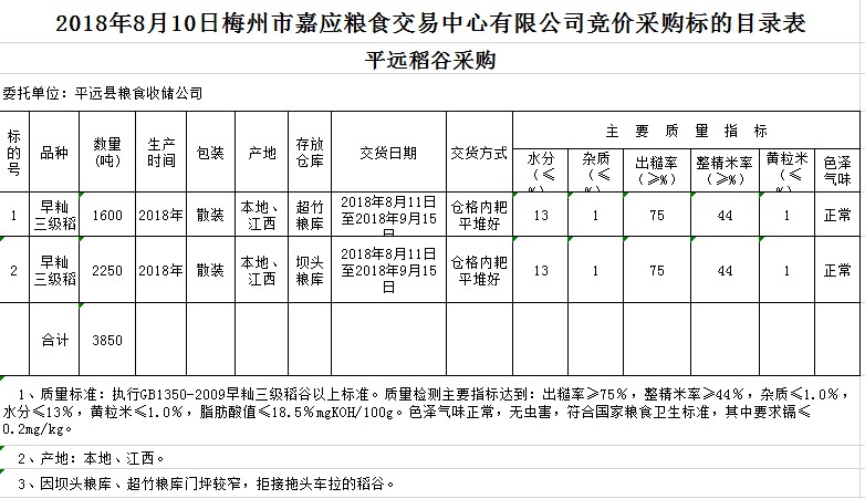 受客戶委托,梅州市嘉應糧食交易中心有限公司定于2018年8月10日(星期五)舉辦糧食競價交易會,平遠縣糧食收儲公司擬采購早秈稻3850噸。